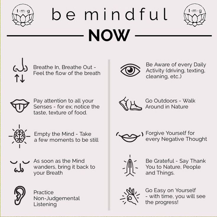 Hiểu 1 cách đơn giản, là bạn sẽ thực sư để ý đến việc mình làm tại thời điểm mình đang sống. Nếu lúc nào đang làm việc/ vui chơi/ nói chuyện hoặc bất cứ hoạt động gì đang cần tập trung (trừ thư giãn) mà bạn cảm thấy đầu óc bắt đầu đi vòng quanh thì hãy tự hỏi: TÔI ĐANG LÀM GÌ – để giúp mang bạn trở lại với sự tập trung nhanh nhất. Nghe thì đơn giản, nhưng nếu bạn cảm thấy không tập trung thì hít vào thở sâu, nhẹ nhàng thư giãn 4-5s để đầu óc quét sạch sự “nhở nhơ” và nhanh chóng quay lại với hiện tại