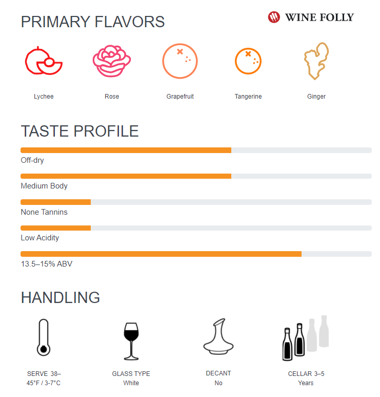 Hương vị của nho Gewürztraminer có mùi vải đặc trưng – rất dễ nhận ra vì ở VN cũng có quả này ngoài ra có còn có mùi ánh hoa hồng và tinh dầu thơm . Cấu trúc rượu chắc chắc, độ acid thấp, có kèm mùi hương hoa quả (xoài, đào và mơ) và vị cay của gừng, quế – điều này thể hiện rõ nở những nốt cuối