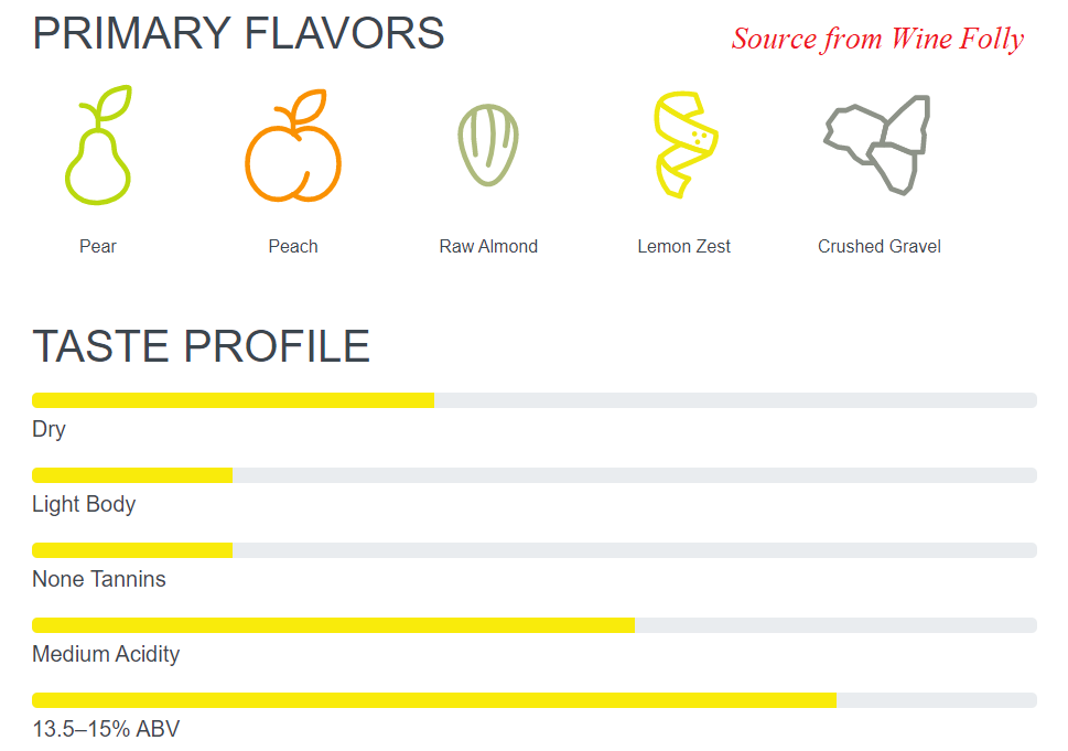 Pinot Blanc: Bây giờ sẽ quay về với giống nho chính của chúng ta ngày hôm nay là Pinot Blanc. Đây là giống nho trắng biến đổi từ Pinot Noir và có nguồn gốc ở vùng Burgundy, Pháp. Ngày nay nó được trồng chủ yếu ở Đức, Bắc nước Ý và vùng Alasace. Nơi mà có khẩu vị rượu vang tươi mới, thơm hương và ngọt nhẹ. Nho Pinot Blanc thưởng được sử dụng làm rượu vang trắng, vang sủi và vang ngọt tráng miệng và thường được so sánh với Chardonnay dựa trên tính Acidity của nó (cả hai đều có medium acidity, thua Sauvigon Blanc độ chua). Tùy theo cách sử lý nho mà Pinot Blanc có thể nhẹ và tươi mát (light bodied) như bản chất hay nếu được ủ qua thùng gỗ sồi sẽ là 1 thứ rượu full-bodied mạnh mẽ. Rượu vang từ Pinot blanc có mùi thơm mạnh với hương táo và độ cồn trung bình hoặc cao (thường là từ Alsace và 1 số vùng ở Đức, Thổ Nhĩ Kỳ vv..)