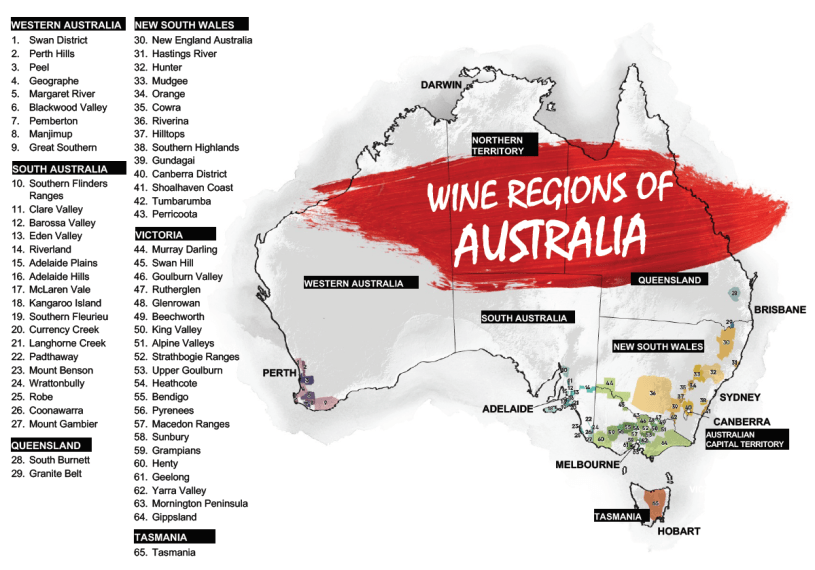 - Vĩ độ của Úc và sự ảnh hưởng của đại dương và độ cao đã làm nên những khu vực trồng vang đặc sắc của nước Úc – các khu vực làm rượu cao cấp nằm ở Nam Úc, Tasmania, Victoria, New South Wales và Western Australia.
