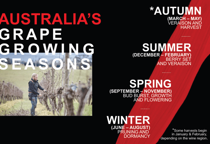 Mùa trồng nho ở Úc: Cũng như các khu vực trồng nho trên thế giới thì việc trồng nho ở Úc cũng phải phụ thuộc vào các thời điểm khí hậu thích hợp. Vì nằm ở Nam bán cầu, nên các mùa và thời điểm trồng nho ở Úc cũng khác với các nước ở Bắc bán cầu.