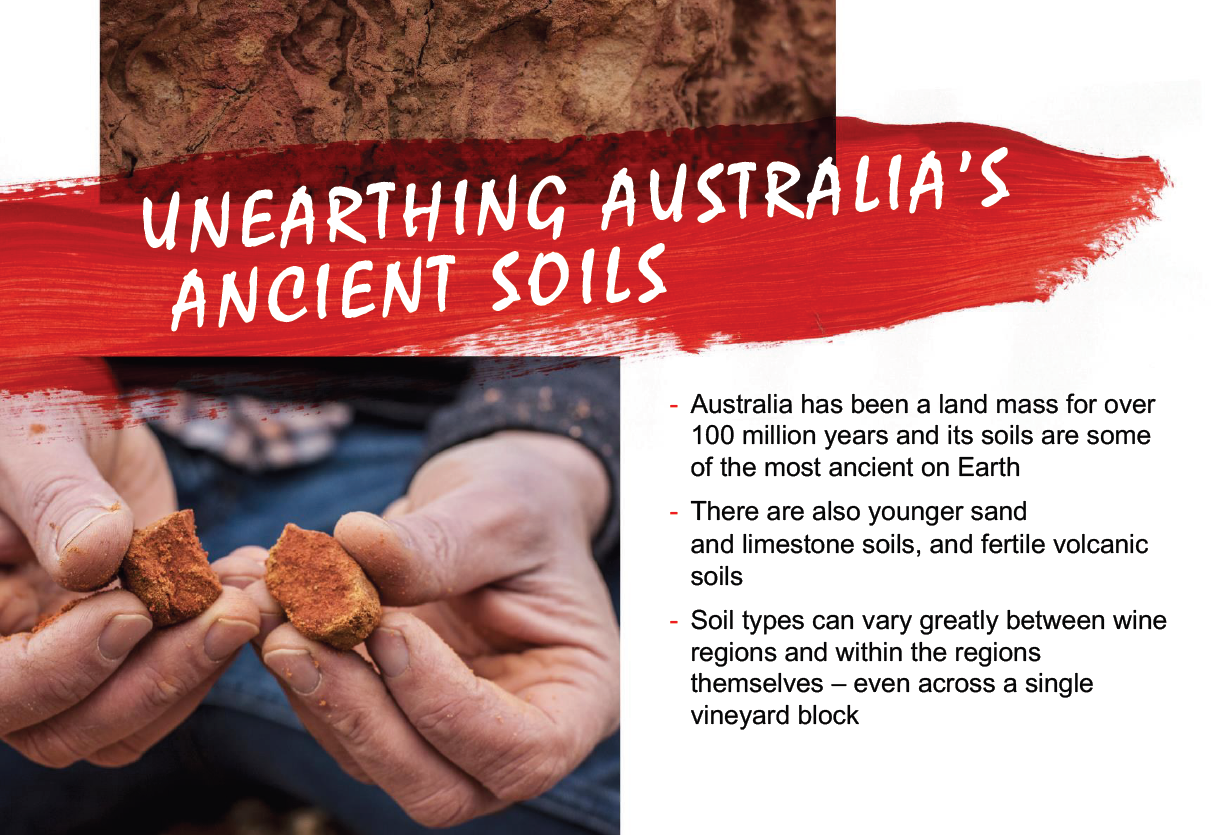 Thổ nhưỡng đất đai ở Úc: Nước Úc là vùng đất rộng hơn trong hơn 100 triệu năm, nên các vùng ở đất ở Úc đều có lịch sử hàng triệu năm tuy nhiên ở Úc cũng có các vùng đất cát trẻ, đất đá vôi rộng lớn và phì nhiêu. Và rõ ràng là các vùng đất có thổ nhưỡng khác nhau cũng sẽ cho ra đời các loại rượu vang khác nhau