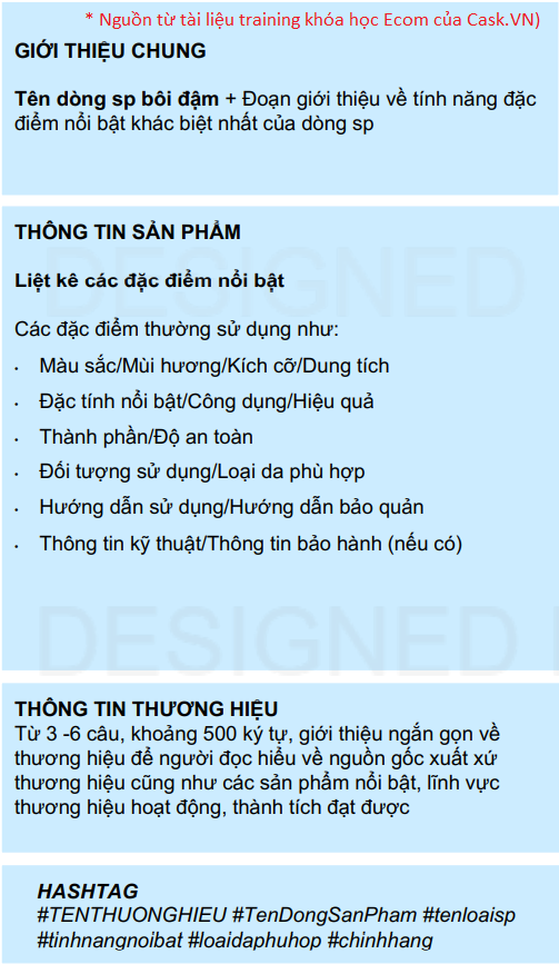 - Miêu tả: Miêu tả là 1 phần rất quan trọng không chỉ cho việc bán hàng mà còn là thương hiệu. Đa phần NTD sẽ tìm kiếm các thông tin về sản phẩm trên website nhà bán hàng hơn là các nơi khác. Ở Mỹ 55% tìm kiếm cho các sản phẩm hàng tiêu dùng là trên website nhà bán so với 28% trên Google). Ngoài ra 65% NTD tìm kiếm thông tin về sản phẩm trước khi quyết định mua hàng (dù cho đó là mua ở Online hay Offline)