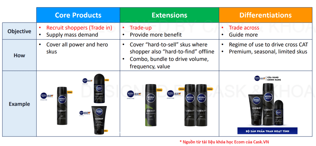 - Hãy xác định chiến lược sản phẩm của bạn trên thị trường và mục tiêu của bạn (ví dụ như để thu hút NTD mới, mở rộng ngành hàng, hay để up giỏ hàng chi tiêu của NTD). Từ đó bạn sẽ quyết định bạn nên thiết lập và đưa các sản phẩm nào lên danh mục và cũng như thiết kế các chương trình khuyến mãi phù hợp. Như hình bên dưới