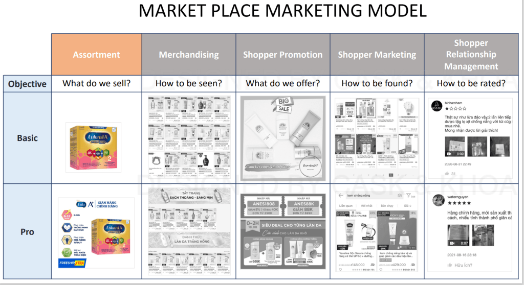 Hãy cùng nhìn qua MARKET PLACE MAKETING MODEL – hiển đơn giản là 1 bảng chiến lược để xây dựng 1 kế hoạch kinh doanh trên sàn thương mại điện tử. Thông qua chiến lược này, chúng ta sẽ dùng để xây dựng/ cải thiện các YẾU TỐ NỀN TẢNG đã đề cập hơn trên và từ đó mang về doanh số, lợi nhuận cho việc kinh doanh.